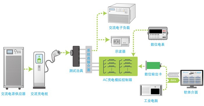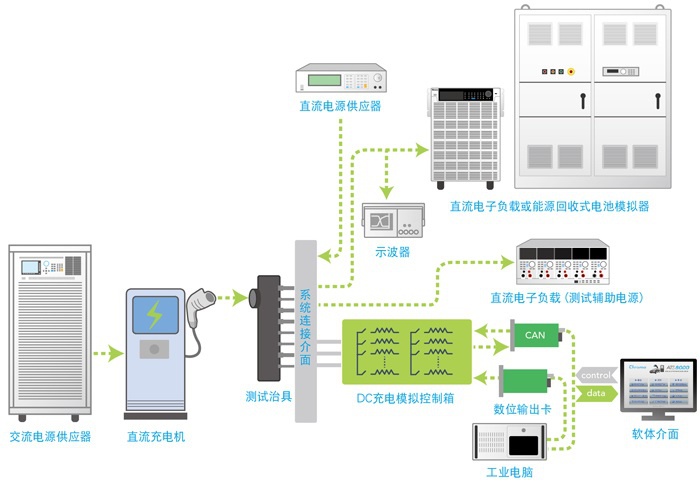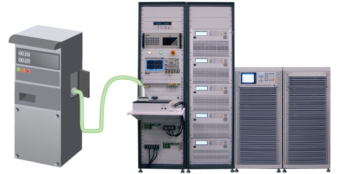 电动汽车充电桩测试系统是以Chroma8000-ATS为基础的客制化系统,专门针对交流充电桩与直流充电机(EVSE)进行验证,并配备了优化的标准测试项目,可符合法规SAE-J1772,CNS15511,中国能源局标准NB/T 33001,NB/T33002,NB/T33008.1与NB/T33008.2;中国国家标准GB/T 18487.1,GB/T 27930,电动汽车传导充电互通性测试规范*…等要求对产品进行测试,所以此系统不但提供了电气特性测试,也进行通信协议测试,可以模拟实际充电桩在操作时,同时输出功率与通信,可测试充电桩是否会在大功率传输过程中所产生的磁场而干扰到通信。并可模拟各信号线在充电过程中 Open/Short/CC1信号电压变化时充电桩相应的保护动作及回应间已排查通讯隐患。