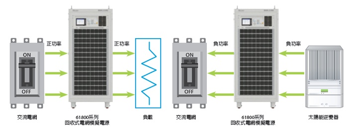 Chroma 61860回收式电网模拟电源是一款定电压输出的可编程交流电源,可应用于一般用电产品(例如: 家电产品,开关式电源)的测试,测试时Chroma 61860回收式电网模拟电源会对负载输出功率,通过拉载过电流设定(OCP)功能来保护Chroma 61860。当待测物为能将能量回馈到电网的产品(例如:太阳能逆变器,双向充放电机)等分散式发电设备时,Chroma 61860在输出电压的同时,若侦测到输出得功率为”负(-)”功率时,Chroma 61860就会启动能源回收机制,将逆变器所产生的逆灌电流/负功率能量转换到交流电网。通常的交流电源无法承受待测物回灌的能量。Chroma 61860可应用到正负电压/电流正反方向的四象限,且具备能源回收功能,正足以成为电网模拟电源。