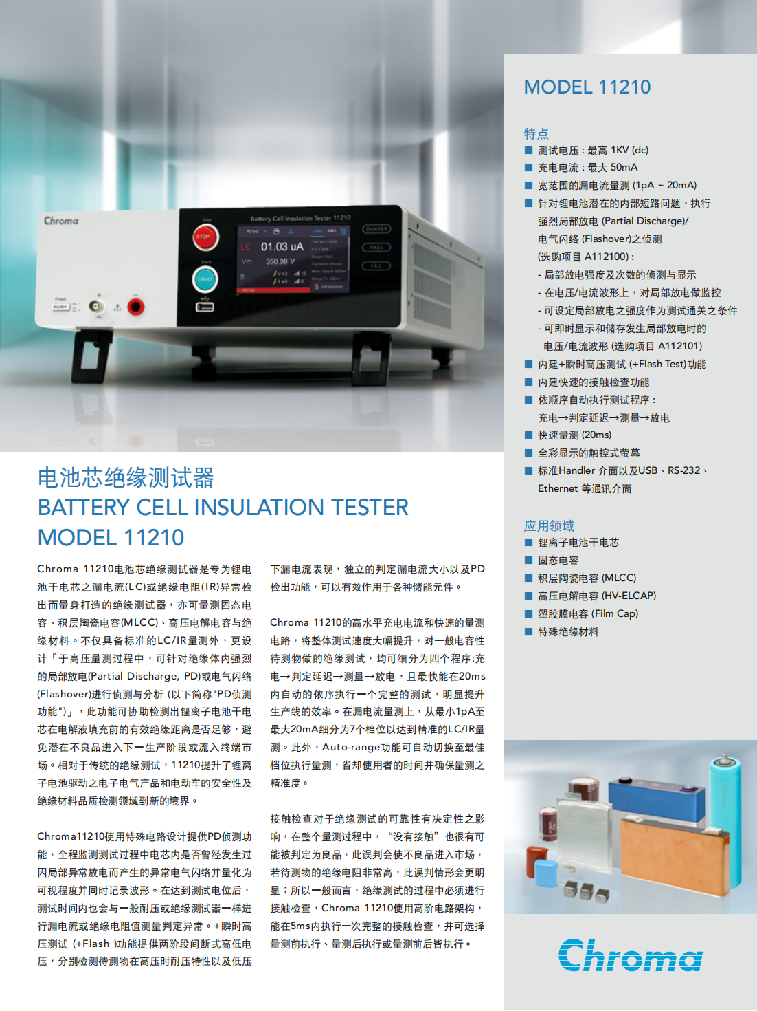 Chroma 11210电池芯绝缘测试器是专为锂电池干电芯之漏电流(LC)或绝缘电阻(IR)异常检出而量身打造的绝缘测试器,亦可量测固态电容、积层陶瓷电容(MLCC)、高压电解电容与绝缘材料。