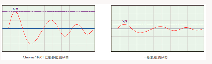 低感量产品如智慧型手机中的Power choke,其工作电压较低且体积较小,可测试电压相对较低,因此用于量测低感量之脉冲测试设备需具备较低电压档 位来进行波形分析,Chroma 19301具有六个电压档位分别为32V,64V,128V,256V,512V及1024V与低0.25V电压辨识度,测试电压可从10V开始进行测试,可有效提高波形判定辨识能力。
